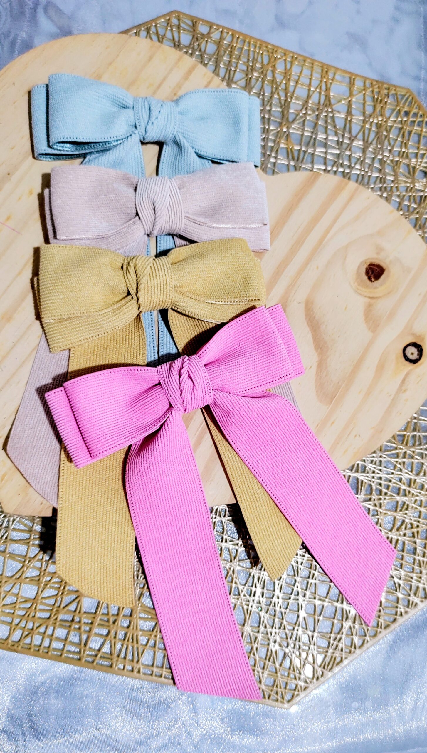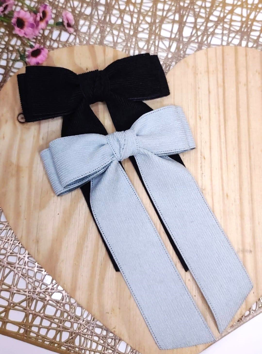 - Laço na fita de veludo cotelê, no bico de pato encapado na fita de Gorgorão.